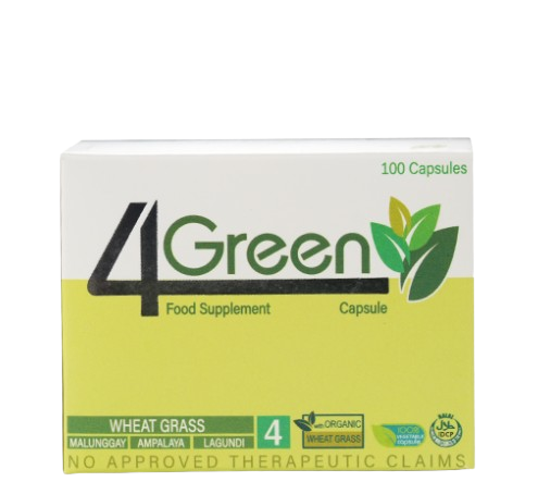 4Green contains Wheat Grass, Malunggay, Ampalaya and Lagundi. These four plants were combined together to create the overall cleansing supplement of the digestive and circulatory system. It helps alkalize and eliminate acidity in our digestive tract. It helps neutralize the toxins in our circulatory system through the high chlorophyll content of these plants.